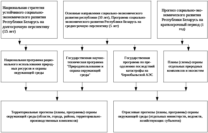 На верхнем уровне эколого-экономическое прогнозирование и планирование осуществляется в рамках системы государственного социально-экономического планирования, которая выглядит следующим образом. На 15-летний период разрабатывается Национальная стратегия устойчивого развития. На ее основе составляются Основные направления социально-экономического развития на 10-летний период. Программа социально-экономического развития на среднесрочную перспективу формируется на 5-летний срок. Прогноз социально-экономического развития на краткосрочный период разрабатывается ежегодно. Все названные документы имеют разделы, отражающие пути решения экологических проблем и рационального природопользования с различной степенью детализации. Наиболее детальные показатели содержит годовой прогноз — лимиты допустимых выбросов загрязняющих веществ, показатели использования природных ресурсов, расчет объема капитальных вложений, направляемых на охрану окружающей среды, перечень природоохранных мероприятий и затраты на их проведение, доведение заданий до областей и Минского горисполкома, отдельных министерств, ведомств и предприятий.