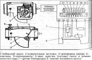 Демпфер 3 с пластиной 4, выполненной как одно целое с измерительной заслонкой 2, служит для гашения колебаний, вызванных пульсациями воздушного потока и динамическими воздействиями, характерными для движущего автомобиля. На входе в измеритель расхода воздуха встроен датчик 7 температуры поступающего в двигатель воздуха. Недостатком измерителя расхода является наличие подвижных деталей и скользящего контакта.