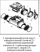 100 мкм и термокомпенсационного пленочного резистора 3. Корпус 5 имеет камеру для размещения электронного блока, который поддерживает постоянным перегрев нити относительно потока на уровне 150° С путем регулирования силы тока измерительного моста.