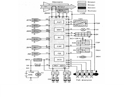 Электронный блок управления (ЭБУ) D23 рисунок 6.14) является центральным звеном всей системы. Он получает аналоговую информацию от датчиков, обрабатывает ее с помощью аналого-цифровых преобразователей (АЦП) и по заложенной в ЗУ программе реализует управление исполнительными устройствами.