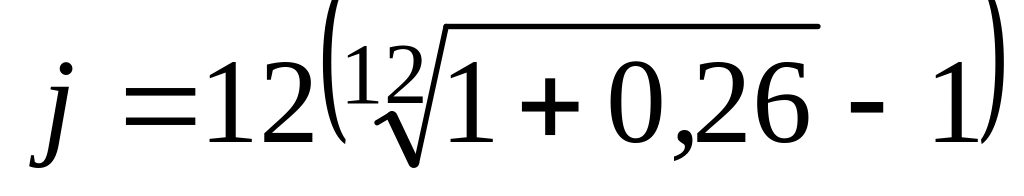 Пример 1: определить номинальную ставку процентов, которая обеспечивала бы годовую доходность в 26 %, если начисление процентов происходит ежемесячно (проценты сложные).