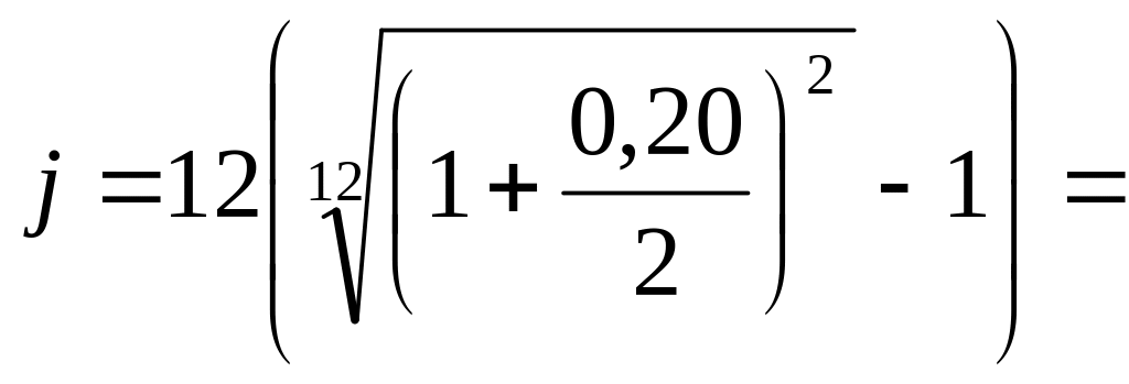 Пример 2: для номинальной ставки 20 % с начислением процентов 2 раза в год найдите эквивалентную ставку, проценты по которой выплачиваются ежемесячно (проценты сложные).