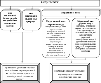 Під впливом часу, сил природи та в процесі експлуатації основні засоби поступово зношуються. Вони втрачають свої первинні фізичні якості, знижуються їх техніко-експлуатаційні можливості, в результаті зменшується реальна балансова вартість основних засобів. Виділяють моральний і фізичний знос основних засобів, а також знос під дією сил природи (рис.4.1).