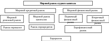 Мировой рынок ссудного капитала на практике представляет собой единство и взаимодействие трех рынков: национального, регионально и мирового. Чаще всего применяют следующую классификацию (рис.).