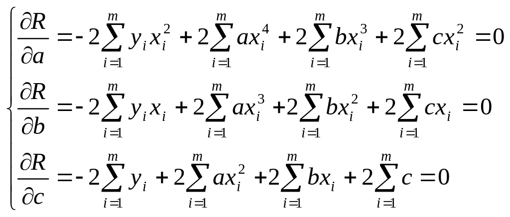 Так, например, для той же функции yiP=axi2 + bxi + c, система уравнений (8) будет выглядеть: