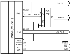 Как было показано выше, шинная организация структуры микроконтроллера позволяет расширять систему путем подключения дополнительных элементов. В МК51 это возможно за счет передачи сигналов шин адреса и данных через порты Р0 и Р2, что позволяет нарастить объем внешней памяти до 64 Кбайт. Использование портов Р0 и Р2 в качестве альтернативной функции интерфейса внешней памяти показано на рис.6.