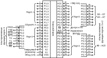 Выводы передачи данных – 4 двунаправленных восьмиразрядных порта Р0,Р1,Р2,Р3, предназначенных для присоединения к внешним устройствам приема и передачи данных.