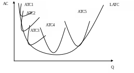В долгосрочном периоде кривая средних валовых издержек образуется как касательная к множеству краткосрочных кривых средних издержек. Результируюшая кривая показывает, как изменяются издержки предприятия в долгосрочном периоде при разных технологических процессах (рис. 38).