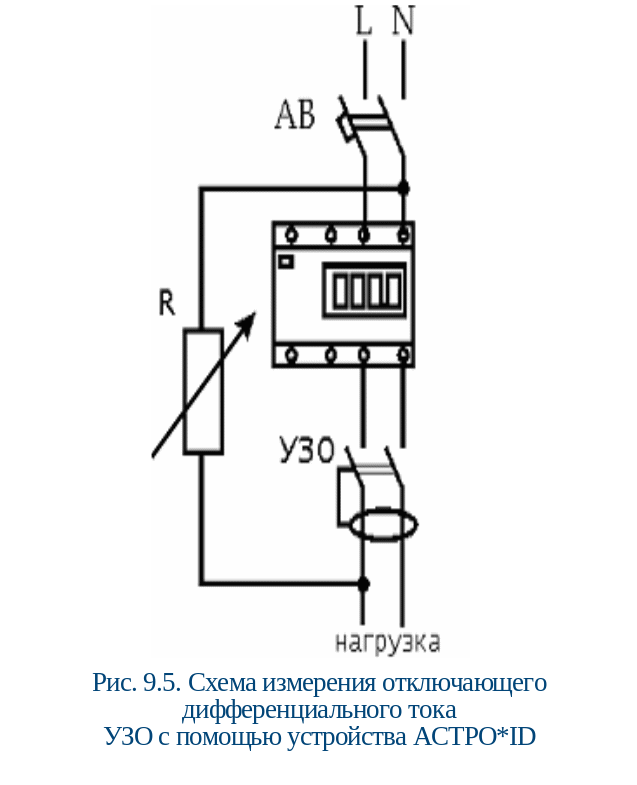 Для этого необходимо собрать схему (рис. 9.5), где R — магазин сопротивлений (см. п. 9.2.1) и провести измерения в следующей последовательности: 1. Отключить от УЗО цепь нагрузки, в том числе и нулевой рабочий проводник. 2. С помощью гибких проводников подключить переменный резистор R. 3. Плавно снижая сопротивление резистора, зафиксировать показания АСТРО*I в момент срабатывания УЗО. 4. Зафиксированное значение тока является отключающим дифференциальным током I данного экземпляра УЗО, которое согласно требованиям стандарта, должно находиться в диапазоне от 0,5 In до In.
