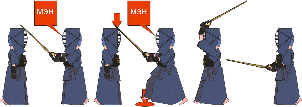 Сделайте большой выпад вперед правой ногой и нанесите удар «мэн». Внимательно следите за тем, чтобы во время удара ваши ноги не оказались на одной линии! Сделайте большой отступ левой ногой назад и нанесите удар «мэн».
