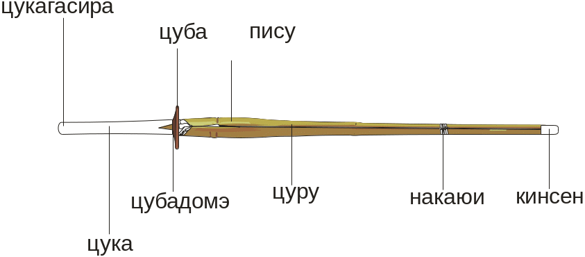 Крепежная струна цуру должна быть внизу. Помните, что боевой меч носится в ножнах режущей поверхность кверху. Синай носится таким же образом.