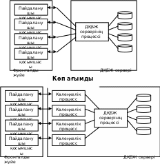 Жүйенің екі негізгі классын айта кеткен жөн: "2N" (немесе “бірге-бір”) принципі бойынша құрылған жүйелер және көп ағымды жүйелер. Көптеп ескі 2N-үлестіруінде әрбір клиент үшін тіптен клиент-программасы физикалық түрде жеке жүйеде орындалса да, серверде жеке процесс қолданылады. Осы мақсатпен, әрбір клиенттік қосымша үшін екі процесс қолданылады, біреуі серверде және біреуі клиенттік жүйеде. Осындай көптеген процесстерді басқаратын ұйымдардың қосымша шығынын азайту мақсатында көп ағымды қосымшалар сол үшін өңделіп жасалынған. Әдетте олар серверлік жүйеде жұмыс жасайтын бірнеше процесстерден тұратын бір кластердің бар болуын ұсынады. Бұл процесстердің ішкі көп ағымды ұйымы бар, олар көптеген клиенттердің сұраныстарын орындауды қамтиды. Көптеген ДҚБЖ-ның негізгі қоюшылары қазіргі жағдайда көп ағымды үлестіруді қолданады немесе осы бағытта қозғалады.