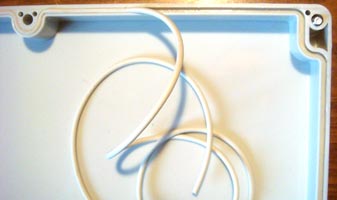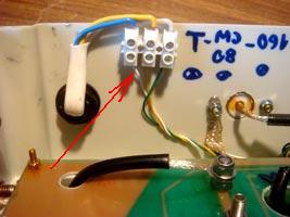 Перехожу к заключительной фазе: установка согласующего устройства и кабелей питания и управления. Открываю крышку пластикового блока, монтаж выполнен хорошо, закрепляю проводники кабеля управления (на фото показаны стрелкой), прокладываю шнур для гермитизации, закрываю крышку, согласующее устройство готово к установке на антенну. Для крепления к антенне, на блоке предусмотрены дюралевые пластины. К самой антенне крепится блок с помощью болтов в месте стыковки текстолитовой втулки (на фото красная вставка). Верхняя часть — активный элемент, нижняя часть — земля, к ней будут крепиться противовесы.