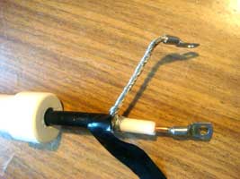 Далее подключаю к клеммам вибратора катушку (из комплекта) и кабель с прибором. Начинаю настройку с расстояния 650 мм, двигаюсь в сторону укорочения, в итоге нахожу минимум КСВ на частоте 7050 Кгц. Поскольку меня больше интересовал телеграфный участок, я сдвинул резонанс вниз по частоте до 7020 Кгц. Закрепляю перемычки с помощью жимков, подгоняю входное сопротивление путем увеличения расстояния между витками катушки. Катушку растянул до предела, межвитковое расстояние составило около 25-30 мм (см. фото ниже), а расстояние от распорки до перемычек — 1050 мм.