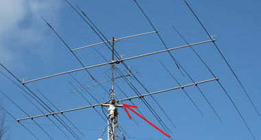 Для моих антенн будет составлять (по классической формуле): L=C/F*K1*K2, где L-межантенное расстояние, С-скорость света (км/с), F-частота (Кгц), К1-коэф.укорочения электрич.длины в физическую=0.96, К2-коэф.размещения (по выбору). Рассчитываю по минимуму, с расстоянием в К2=0.1 лямбда: Для антенны на 40 м: L=300000/7020*0.96*0.1 = 4.1 м Для антенны на 20 м: L=300000/14020*0.96*0.1 = 2.05 м Труба почти 5 м без растяжек с нагрузкой (вес антенны) на самой макушке это рискованно, при сильном ветре в моей конструкции может «загнуть» или сломать рычаг поворотного узла, я решил поступиться правилами расчета, сделал «на глаз» - 2.5 м. Для 20-метрового диапазона все в рамках расчета, а для 40-ки оно составило 0.06(маловато…). Конечно абсолютного влияния не исключить, нужно идти на компромисс, тем не менее как показала практика N3L работает очень хорошо на втором этаже. Вариант построения многоэтажных антенных конструкций с использованием растяжек для трубостойки закрепленных у основания (красная стрелка, см. ниже произведение RU1AB). Судя по пропорциям, растояние между антеннами приблизительно такое же как у меня (точнее как в рекомендуемом минимуме), в этом случае можно трубу сделать длинее и навесить еще антенны.