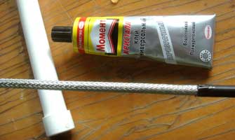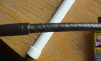 На этом настройка вибратора закончена. Приступаю к изготовлению кабеля для снижения, собственно это будет отрезок, длиной чуть больше трубостойки. Поскольку на трубостойке будут размещены две антенны, то промежуточный узел соединения кабелей будет находится у нижней антенны. Короткие кабели от антенн нужны для быстрого отключения от основных. На случай ремонта антенны или другого обслуживания, основные останутся на мачте, а коротышки вместе с антеннами могут сниматься или заменяться. В этом месте можно поставить антенный переключатель, если вы надумаете запитать каждую антенну отдельным кабелем или построить третий антенный этаж (например, на WARC-диапазоны или УКВ). До переключателя будет один, после каждая антенна со своим. Вернусь к N3L. Мне необходимо закрепить этот кабель вместе с устройством подавления синфазных токов, текущих по внешней стороне оплетки кабеля (BALUN). Внутренний диаметр фильтра 10 мм, а внешний кабеля 12 мм, мой кабель естественно не входит внутрь БАЛУН-а. приходиться приспосабливаться. Использую совет друзей: снимаю наружную полиэтиленовую оболочку на длину большую длины БАЛУН-а на 12-15 см, промазываю клеем МОМЕНТ внешнюю оплетку кабеля, далее изолирую с помощью изоленты 3М (высококачественная лента для профессионального применения, подходит для монтажа при низких температурах), тонкая, эластичная, хорошо прилипает.