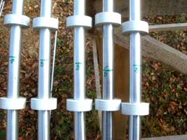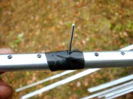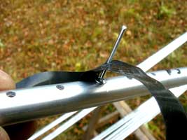 Размечаю центры остальных пассивных элементов и устанавливаю элементы на траверсу. Работа спорится и «помошники» лезут под руки. На активных элементах, концевые трубки до настройки не заклепывал. Чтобы трубки не перемещались, я поступил следующим образом: устанавливаю концевую трубку на исходное для настройки положение, вставляю заклепку в отверстие, и фиксирую ее изолентой. Таким образом, я могу удлинять или укорачивать элемент при настройке. Выдвинул трубку и переставил заклепку в новое (следующее) отверстие, достаточно удобно и надежно. Чтобы концы вибраторов на 14 и 21 Мгц не соприкасались друг с другом, ввиду близкого расположения, устанавливаю текстолитовые распорки с помощью червячных стяжек.