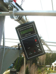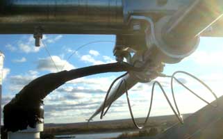 Лучших результатов добиться не удалось, возможно местные условия — строения, деревья, конструкция мачты, растяжки, все это влияло на настройку антенны, хотя я старался максимально удалить (отклонить) антенну с помощью веревок от влияющих на нее факторов. Но, что есть — то есть. Заклепываю концевые трубки элементов, и поднимаю антенну на рабочую высоту по тому же маршруту, что и предыдущую. Завожу левое крыло БУМ-а над ярусом растяжек, затем правое, так перешагиваю все три яруса. Закрепляю траверсу с двух сторон на ложементе парами U-образных хомутов. Наверху повторяю контрольные замеры, корректирую расстояние между проводниками линии, пришлось растянуть до предела, а межвитковое расстояние катушки наоборот«сожмурить» — витки легли вплотную. КСВ на этой высоте, во первых стало чуть меньше и немного сдвинулось вверх по частоте.