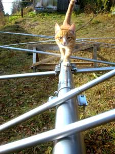 Кабели одел в броню, чтобы предохранить оболочку, поскольку все равно ветром будет бить по мачте, да и при вращении чтобы не терлись об элементы мачты. Это гофрированная оболочка внешним диаметром 25 мм(купил в магазине электротоваров), для каждого кабеля своя, можно использовать больший диаметр и поместить оба кабеля в одну, мне удобнее так (см. фото). Ну кажется все, мелкие дела закончил с антеннами AD-347 и N3L. Кабели подключены, вращение проверил, КСВ при длинных кабелях остался прежний, резонанс на той же частоте, что при настройке, все благополучно, можно работать!