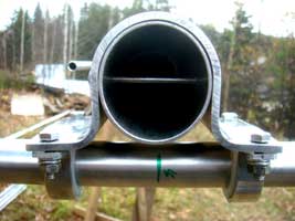 Поднимаю стойку, устанавливаю на поворотное устройство, с закрепленной антенной на ложементе. Если вы обратили внимание на стойку с «рогами», рога - это и есть ложементы для антенн. Стандартное крепление исполнено хорошо, но я счел его недостаточно практичным. Объясню почему. Расстояние между хомутами крепления траверсы около 20 см — слишком мало, при активной работе в соревнованиях, когда крутишь антенну то в одну сторону, то в другую, вся нагрузка ложится на короткий участок БУМ-а. Рычаг все-таки большой, плюс инерция конструкции, может сначала загнуть, а потом и переломить БУМ. Да и ветер все время будет мотать антенну… Поэтому я решил увеличить это расстояние до метра, также оставил в своей конструкции место снизу(под БУМ-ом, поэтому и «рога»), чтобы иметь возможность работать с клеммами на элементах. К ложементам БУМ крепится с обеих сторон также парами U-образных хомутов.
