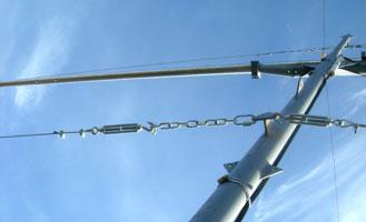 Продолжаю строительство антенного комплекса. В начале статьи я упоминал, что на низких диапазонах будет работать вертикал, начинаю его сборку. Антенна состоит из труб разных диаметров (60-10мм). Сборка также проста, скручиваю секции телескопической конструкции на болты, закрепляю пластины с коушами для растяжек в трех местах антенны. Три яруса растяжек, по высоте приблизительные расстояния — 17 м, 13 м и 7,5 м. Макушку заклепываю, поскольку трубы значительно меньшего диаметра. Две растяжки верхнего яруса — комбинированные, часть их используется как емкостная нагрузка, к биметаллической проволоке через изолятор крепитсяполиэтиленовый трос диаметром 5 мм. Достаточно прочный, диэлектрический, практически не вытягивается, не боится УФ лучей и не впитывает влагу. Мне очень понравился, рекомендую всем. Его я использовал для растяжек данной антенны.
