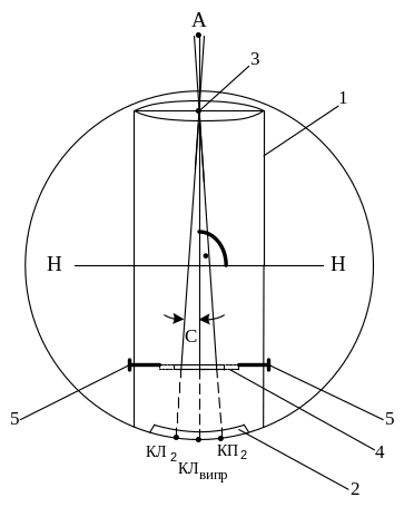 1 – зорова труба; 2 – алідада горизонтального круга; 3 – оптичний центр об’єктива; 4 – зміщене кільце сітки ниток; 5 – виправні гвинти.