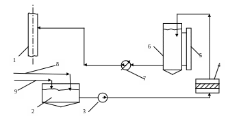 1- всасывающий колектор питательного насоса, 2- растворный бак, 3- насос рабочего раствора , 4- мехфильтр, 5- указатель уровня , 6- расходный бак (бак-дозатор) , 7- насос-дозатор (либо ежектор), 8- подвод питательной воды (конденсата), 9 – подача исходного раствора реагентов