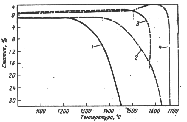а) кривые 1 и 2 иллюстрируют деформацию огнеупора, состоящего из зернистой основы и большого количества (40-50%) связующей ее стекловидной фазы (шамотные изделия). При нагреве количество жидкой фазы увеличивается. Основа, содержащая кремнезем и глинозем, растворяется в ней, вследствие чего вязкость жидкой фазы возрастает. поэтому усадка образца при испытании, начинаясь при сравнительно низких температурах, происходит плавно;
