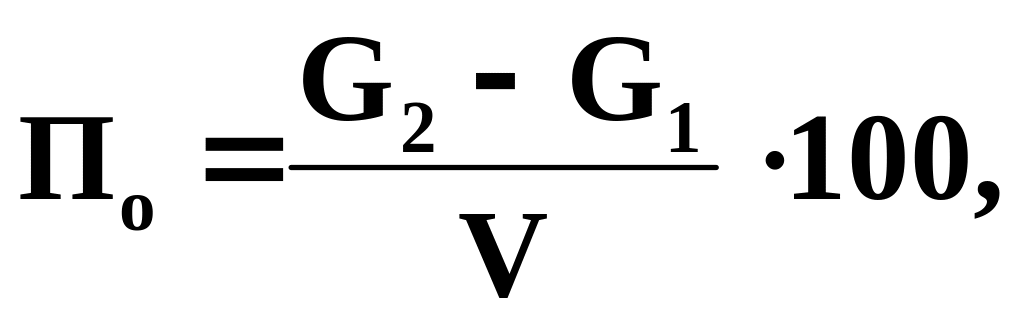 Наименьшей пористостью обладают литые изделия – Пк = 0 – 16%; обычные огнеупоры, изготовленные пластичным формированием или полусухим прессованием, имеет истинную пористость в пределах 16 – 30%; изделия, предназначенные для тепловой изоляции, имеют пористость Пк = 50 – 90%. Открытая пористость (кажущаяся) определяется насыщением водой исследуемого образца, путём его кипячения в течение 3 часов. Вычисления открытой пористости, процент, производится по формуле: