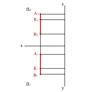 Из свойств параллельного проецирования известно, что если точка делит отрезок прямой в данном отношении, то проекции этой точки делят одноименные проекции прямой в том же соотношении.