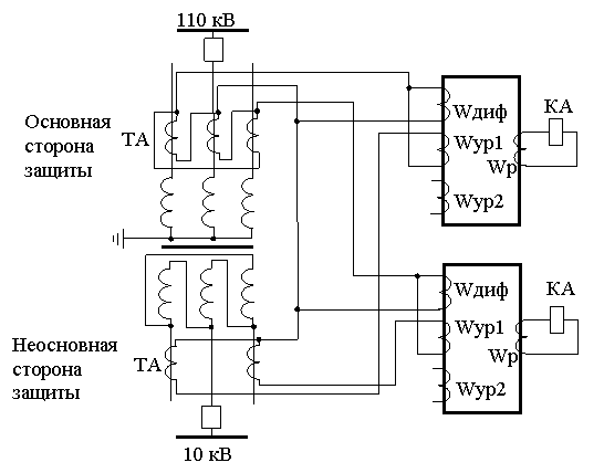 Схема подключения реле РНТ-565 при основной стороне ВН приведена на рисунке 5.