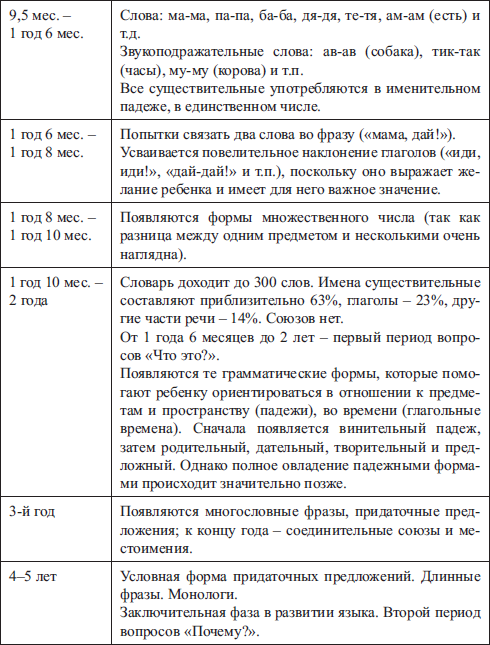 Подробное описание поэтапного развития речи ребенка до трех лет на материале детской речи на разных языках содержится в работах А.А. Леонтьева (1965; 1997). Он выделяет три основных этапа в речевом развитии ребенка до трех лет: 1) доречевой, разделяемый, в свою очередь, на период гуления и период лепета (примерно 0,2–0,5 и 0,5–0,11); 2) дограмматический, или этап первичного освоения языка (0,11 – конец второго года); 3) этап усвоения грамматики (третий год жизни).