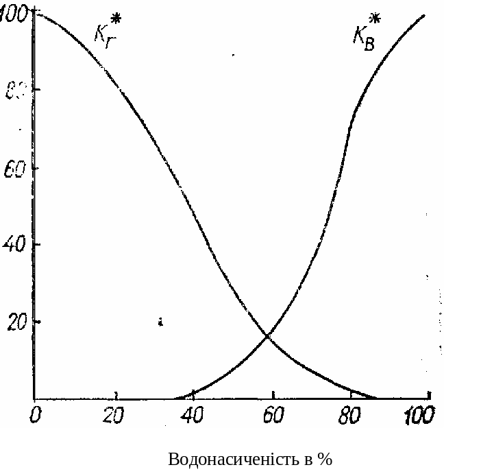 Для характеристики проникності пористого середовища в умовах насичення її двома і більше фазами введено поняття фазової і відносної фазової проникності. Фазова проникність визначається за законом Дарсі для кожної з фаз окремо. Відносна фазова проникність – це відношення фазової проникності до абсолютної. На рис. 2.1 показано залежність відносних фазових проникностей піску для газу і води від насиченості пористого середовища водою. Аналогічний вигляд мають залежності фазових проникностей за наявності в пористому середовищі нафти і води чи води і газу.
