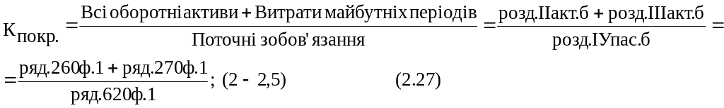 Коефіцієнт покриття: -найбільш загальний показник ліквідності характеризує співвідношення між усіма поточними активами та короткостроковими зобов'язаннями.