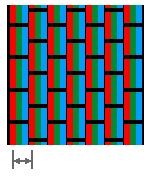 Минимальное расстояние между полосами люминофора одинакового цвета называется шагом полос (strip pitch) и измеряется в миллиметрах (см. рис. 10). Чем меньше значение шага полос, тем выше качество изображения на мониторе. При апертурной решетке имеет смысл только горизонтальный размер точки. Так как вертикальный определяется фокусировкой электронного луча и отклоняющей системой.