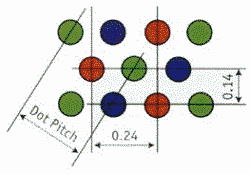 Минимальное расстояние между люминофорными элементами одинакового цвета в соседних строках называется шагом точек (dot pitch) и является индексом качества изображения. Шаг точек обычно измеряется в миллиметрах (мм). Чем меньше значение шага точек, тем выше качество воспроизводимого на мониторе изображения. Расстояние между двумя соседними точками по горизонтали равно шагу точек, умноженному на 0,866.