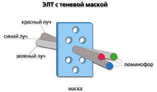 Итак, каждая пушка излучает электронный луч (или поток, или пучок), который влияет на люминофорные элементы разного цвета (зеленого, красного или синего). Понятно, что электронный луч, предназначенный для красных люминофорных элементов, не должен влиять на люминофор зеленого или синего цвета. Чтобы добиться такого действия используется специальная маска, чья структура зависит от типа кинескопов от разных производителей, обеспечивающая дискретность (растровость) изображения. ЭЛТ можно разбить на два класса - трехлучевые с дельтаобразным расположением электронных пушек и с планарным расположением электронных пушек. В этих трубках применяются щелевые и теневые маски, хотя правильнее сказать, что они все теневые. При этом трубки с планарным расположением электронных пушек еще называют кинескопами с самосведением лучей, так как воздействие магнитного поля Земли на три планарно расположенных луча практически одинаково и при изменении положения трубки относительно поля Земли не требуется производить дополнительные регулировки.