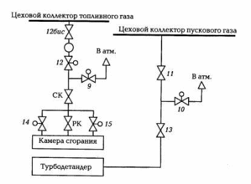 Топливный газ поступает из коллектора в камеру сгорания через кран № 12бис, расходомерную диафрагму, кран № 12, стопорный (СК) и регулирующий (РК) клапаны. Краны № 14 и 15 используются для запальной и дежурной горелки в период пуска агрегата.