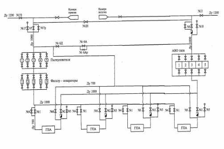 После очистки газ по трубопроводу Ду 1000 поступает во входной коллектор компрессорного цеха и распределяется по входным трубопроводам ГПА Ду 700 через кран № 1 на вход центробежных нагнетателей.