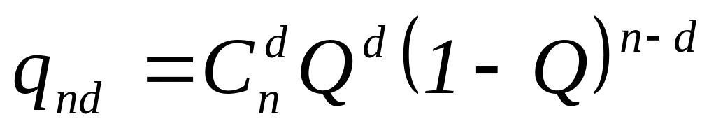 Біноміальний закон. Якщо обсяг вибірки n значно менший, ніж обсяг усієї партії ІС N, тобто n0,1N, то гіпергеометричний закон зводиться до біноміального, при цьому ймовірність q появи d відмов в партії з n ІС буде визначатися формулою: