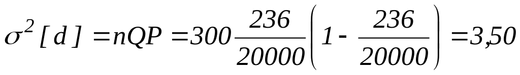 Припустимо, що в контрольованій партії, яка складається з 20000 ІС, є 236 дефектних виробів. Якщо з цієї партії взяти вибірку обсягом 300 ІС, то чому буде дорівнювати імовірність qnd знайти в ній 2 дефектних вироби? Визначити також математичне очікування (найбільш імовірне значення кількості дефектних ІС), дисперсію і середньоквадратичне відхилення для вказаної вибірки.