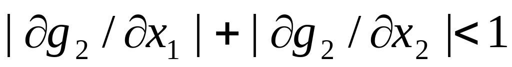 Успех процесса приближения во многом определяется удачным выбором начального вектора Xk=1 (он должно быть достаточно близким к истинному решению). Метод гарантированно сходится, если выполняется условие ||J(x1, x2,…,xn)||<1, где J(x1, x2,…,xn) – матрица Якоби для функций g1,…, gn, а ||J|| – ее норма. Тогда для системы из двух уравнений