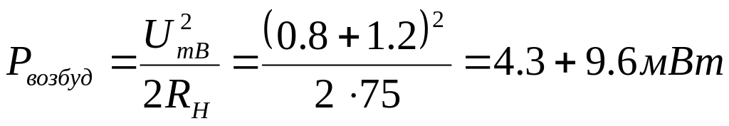 Мощность радиосигналов, сформированных в возбудителе, обычно измеряется единицами или десятками милливатт. Современные возбудители обычно обеспечивают амплитуду выходного напряжения Um возбудит = 0.8+1.2В на нагрузке RH = 75 Ом, что соответствует мощности: