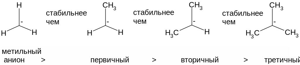 Поскольку алкильные группы являются электронодонорными (+I-эффект), то стабильность АЛКИЛЬНЫХ карбанионов изменяется в следующем порядке: