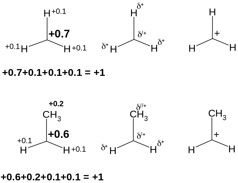 Из первой формулы следует, что положительный заряд (+1) размыт, то есть ДЕЛОКАЛИЗОВАН по атомам водорода и углерода, хотя в основном сконцентрирован на атоме углерода.
