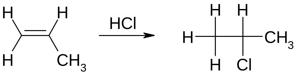 В отличие от этена, присоединение протона в данном случае может приводить к двум изомерным карбокатионам I и II (см. схему ниже). Оба эти катиона крайне реакционоспособны, поскольку один из атомов углерода в них трехвалентен. Считается, однако, что катион II более стабилен, чем I, что ведет к предпочтительному образованию в качестве промежуточной частицы именно карбокатиона II. Последнее обстоятельство, в свою очередь, обусловливает образование 2-хлорпропана в качестве основного продукта реакции.