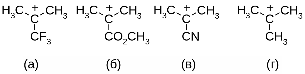 Понятно также, что если замена атомов водорода в метильном катионе на электронодонорные (+I-эффект) заместители обеспечивает стабилизацию карбокатиона, то замена атомов водорода на электроноакцепторные (‑I‑эффект) заместители понижает стабильность катиона, поскольку приводит к повышению реального положительного заряда (δ+) на карбокатионном центре. Примером групп, обладающих ‑I‑эффектом, могут служить тригалогенметильные группы. Их электроноакцепторный характер обусловлен наличием в них атомов галогена, обладающих высокой электроотрицательностью. Группы CN, NO2, CO2CH3 и др. также являются электроноакцепторными и обладают ‑I‑эффектом.