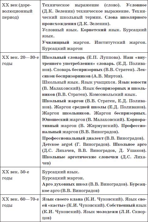 Экскурс в историю позволил выявить не только используемый исследователями понятийно‑терминологический аппарат, но и их предпочтение того или иного обозначения: термина язык [Тиханов 1899; Зеленин 1905; Бодуэн де Куртене 1908; А.И. Томсон 1910; П.С. Богословский 1927; Е.Д. Поливанов 1931; В.В. Стратен 1931; В.Виноградов 1934 и др.], жаргон [Тиханов 1899; Бодуэн де Куртенэ 1908; Копорский 1927; Е.Д. Поливанов 1931; В. Виноградов 1934; Ахумян 1957; Кевлишвили 1958; Сорокин 1965; Серебренников 1970; Копыленко 1976; Лошманова 1975; Скворцов 1979; Дубровина 1980; Борисова‑Лукашанец 1983; Туманян 1985; Грачев 2002 и др.], арго [Тиханов 1899; Г. Виноградов 1926; Ларин 1928; Стратен 1931; В. Виноградов 1934; Жирмунский 1936; Ушаков 1935; Лихачев 1938; Ахумян 1957; Кевлишвили 1958; Сорокин 1965; Елистратов 1994 и др.], сленг / слэнг [Скворцов 1966; Борисова‑Лукашанец 1983; Мазурова 1988; Грачев, Гуров 1989, Рожанский 1992; Береговская 1996; Никитина 1998, 2003 и др.]. Однако, как было отмечено выше, в научных исследованиях «наблюдается разнобой в понимании и употреблении этих терминов» [Грачев 1997: 11].