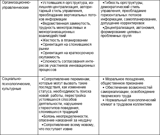 Важное направление в изучении инновационных процессов – выявление реальных факторов, способствующих или препятствующих их осуществлению. Наиболее удобно их представить и систематизировать в виде таблицы, в которой все факторы, препятствующие и способствующие инновационной деятельности, разделены на 4 группы (табл. 4.1.).