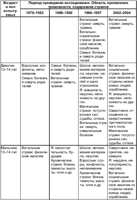 Интересна динамика страхов, связанных с будущим. В 1979–1982 гг. в нашей работе эта группа страхов занимала 5–6‑е места, встречаясь в ответах около 45% старшеклассников. В 1989–1992 гг. эти страхи вышли на первое место у мальчиков – с 13–14, а у девочек – с 15–17 лет. В 1996–1997 и 2002–2004 гг. подобные страхи стали характерными для раннего юношеского возраста, причем у юношей они попадают в две категории страхов – и в традиционную категорию Я, касаясь широкого круга вопросов, связанных с профессиональным и личным будущим, и в категорию социальных страхов, связанных со службой в армии.